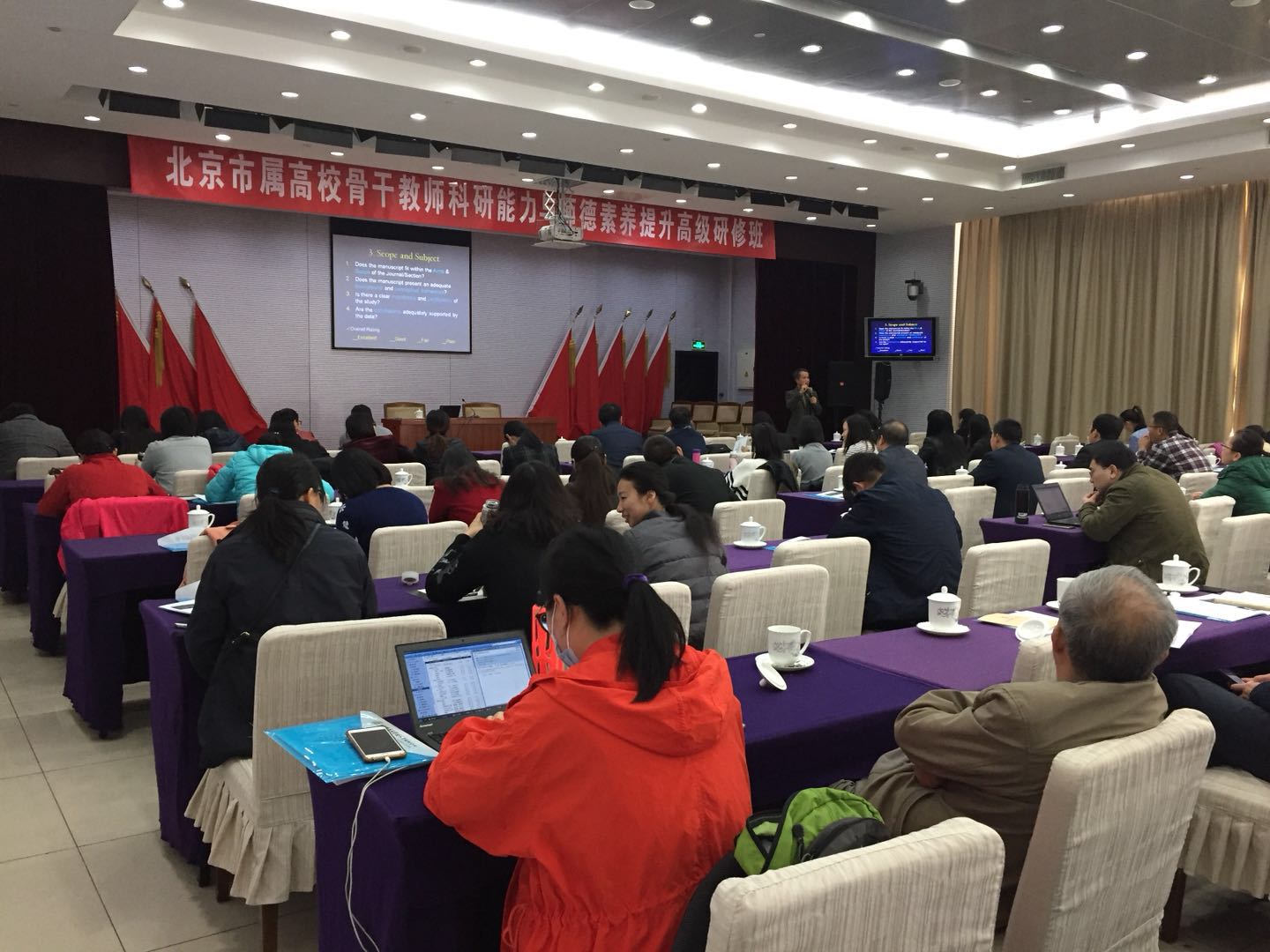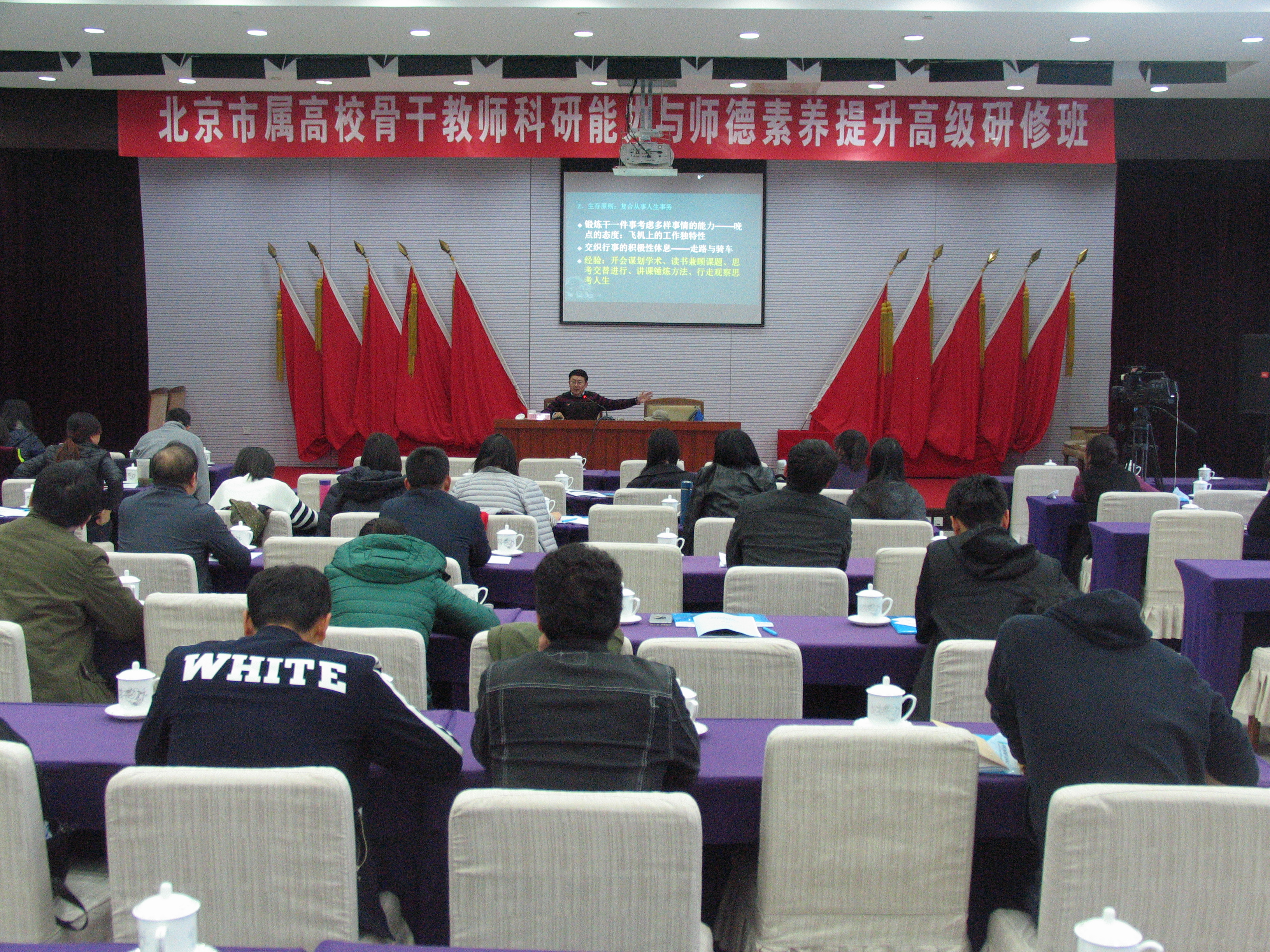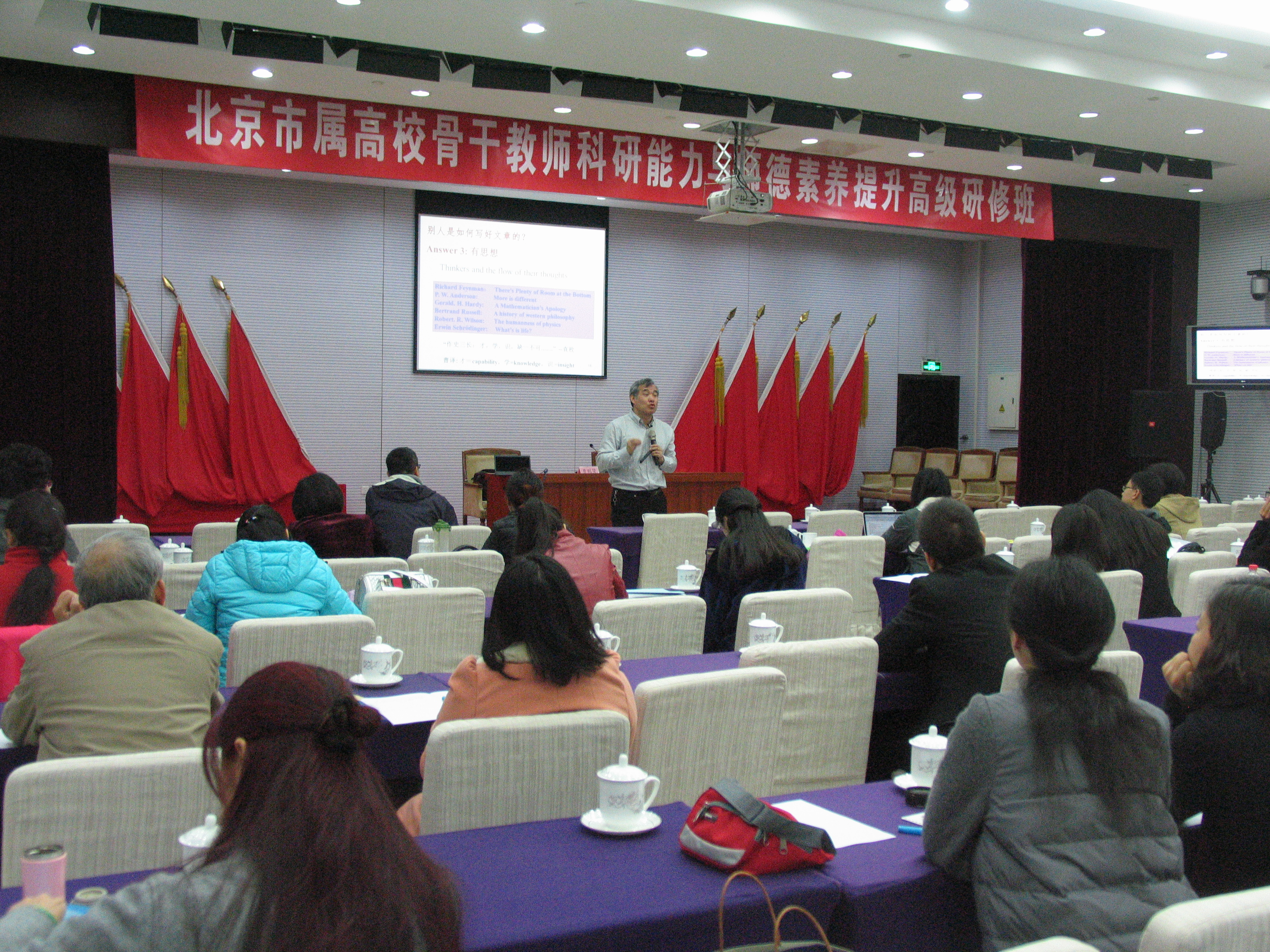 2017年10月29日至11月1日,365bet娱乐官网(以下简称“高师中心”)举办了北京市属高校青年骨干教师科研能力与师德素养提升高级研修班(理科),来自19所市属高校的90名青年教师参加了研修班。研修班由高师中心教师进修办公室刘书莉主持。本次研修班邀请到的授课专家为美国肯塔基大学熊幼翎教授、清华大学朱永法教授、中国科学院曹则贤研究员、北京师范大学周星教授和同济大学马卫民教授。几位“学术大牛”分别以《发表SCI科研文章的要点及细节》、《自然科学基金申请的关注点》、《写篇文章去发表》、《如何追求完善—我的为师之道》和《青年教师如何进行职业规划与科学研究》为题,分享了国家自然科学基金项目申请的诸多技巧、SCI 论文撰写、期刊选择和发表过程中的方法以及青年教师如何做老师、如何进行职业规划等一系列青年教师非常关注的热点问题。几位“业界泰斗”深厚的知识底蕴、实事求是的学术态度和不倦探索的学术作风让大家钦佩不已。与会教师们深刻感受到了他们作为科研先锋所付出的努力和勤奋,体会到了他们潜心科研、真情育人的诚挚和投入,在思想和科技领域,他们发现了另一个更为多彩绚丽的世界。