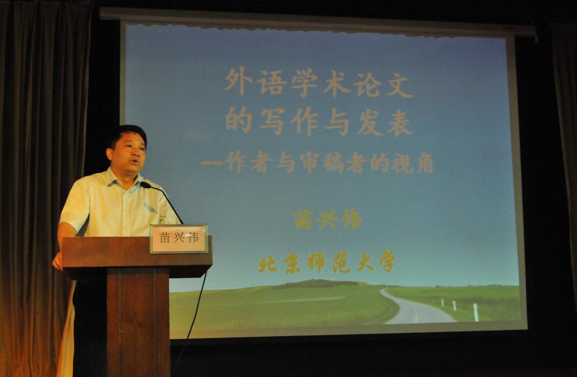 北京师范大学苗兴伟教授做了题为《外语学术论文的写作与发表》的专题报告。苗兴伟教授从审稿专家的角度详细展示了外语类核心期刊的用稿标准和要求以及论文的质量指标。同时结合自己在科研中的方法和思路,通过列举大量实例,指出学术研究的动力是决定论文质量的关键因素。对于论文写作的步骤和方法苗兴伟教授做了详细的讲解和指导。